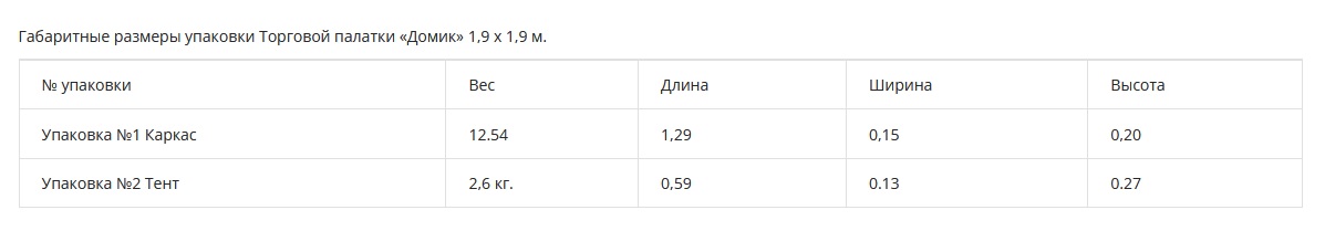 Торговая палатка Домик размером 1,9х1,9 м с каркасом из стальной трубы диаметром 18 мм, покрытой порошковой краской. Угловые соединения диаметром 22 мм. Быстрая сборка без болтового крепления. Размер основания палатки: 1,9 x 1,9 м. Высота боковой стенки: 1,85 м. Высота в коньке: 2.15 м. Влагостойкость тента 2000 мм водяного столба. 4 входа, наличие козырька. Вес: 15 кг.